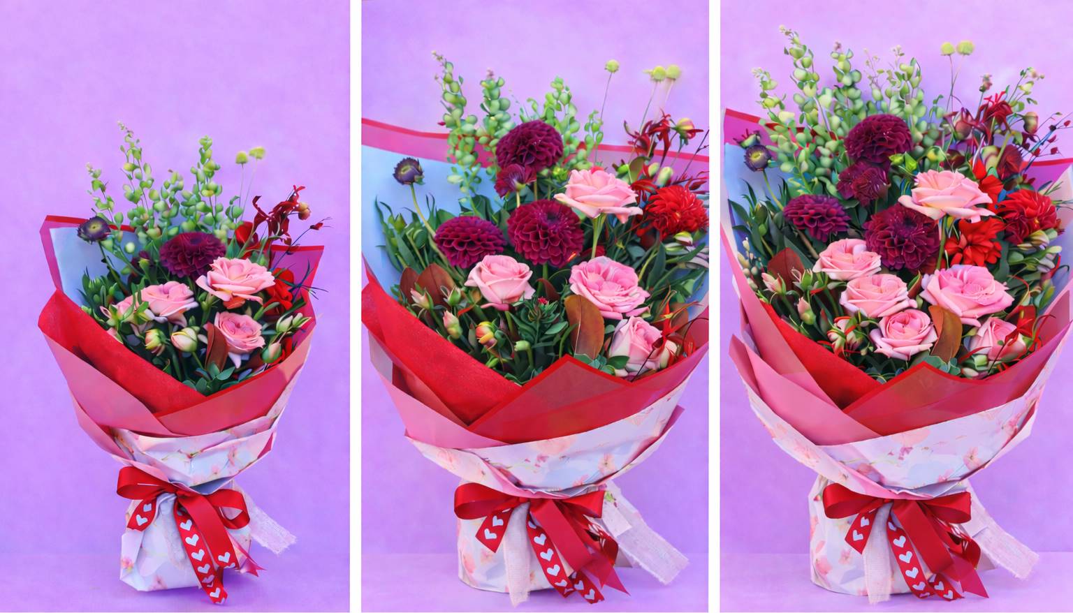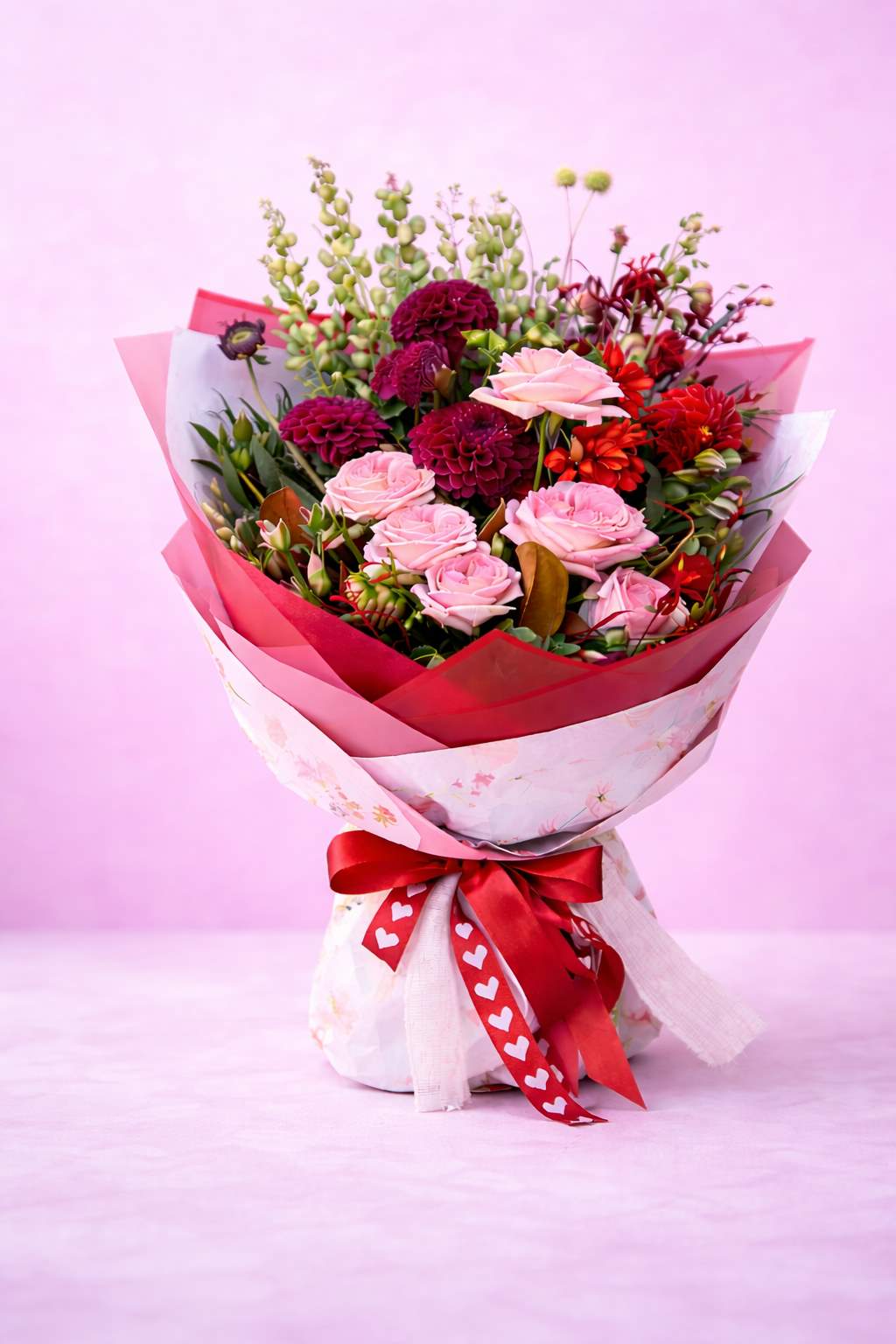 A romantic expression of the season, this bouquet features a lush blend of soft pink and rich red florals, including premium roses, dahlias, hydrangea, and other beautiful seasonal blooms.